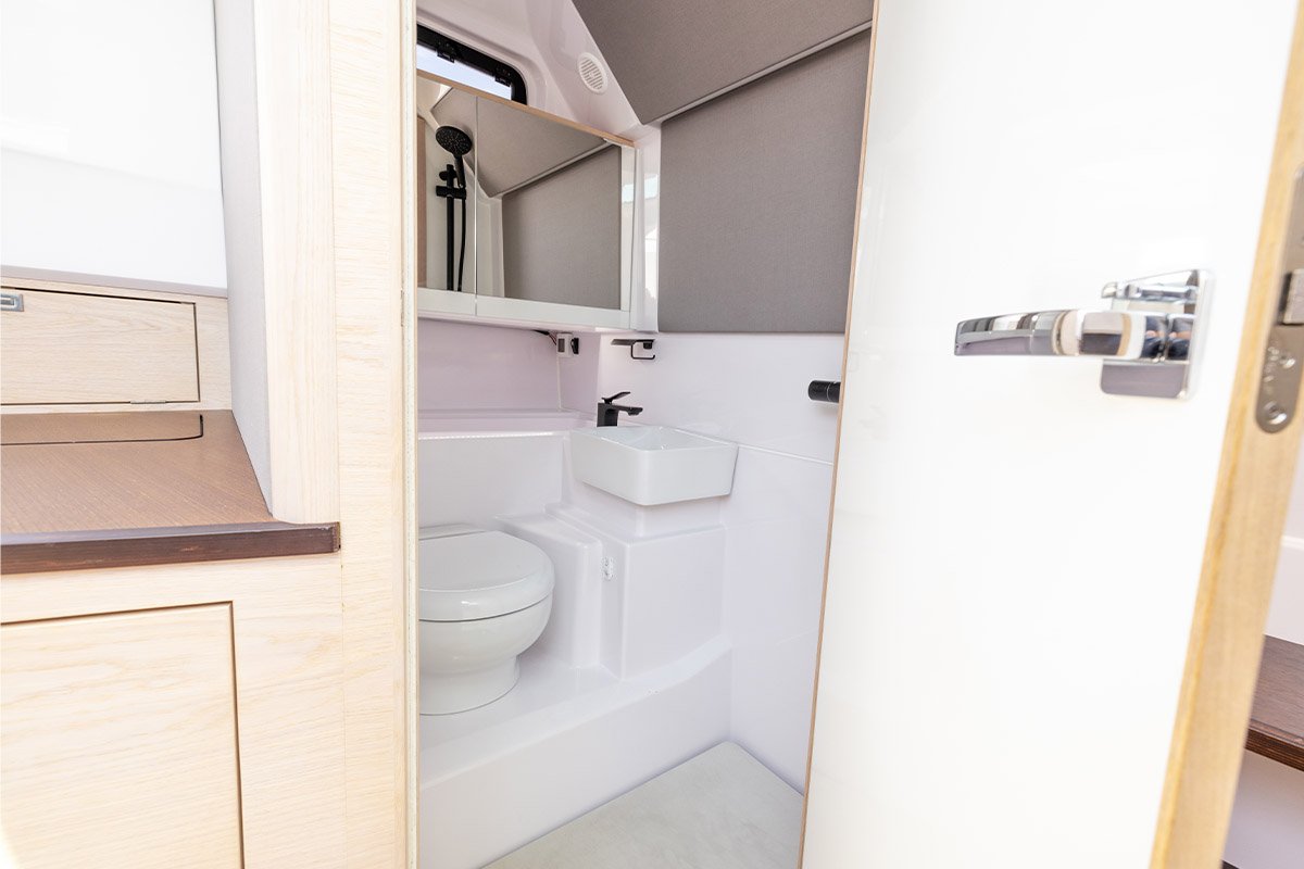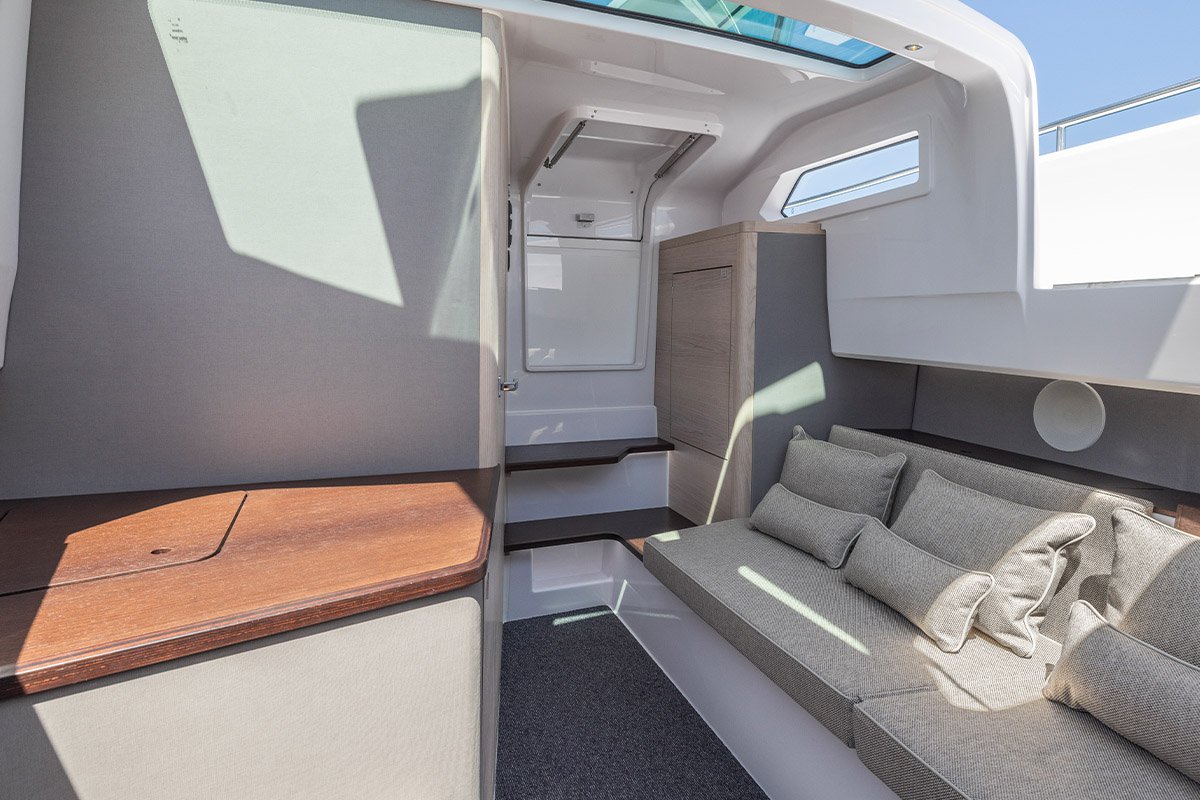 Extend your adventures with the Aft CabinIf you want to go further and stay out longer, while bringing more quests, opt for the optional Aft Cabin, which comfortably accommodates two people, and has plenty of storage/space for an additional head compartment. |