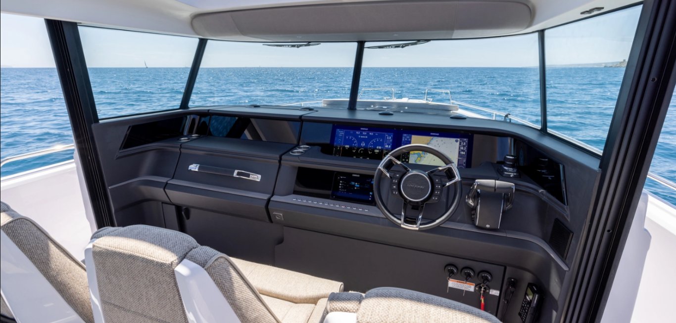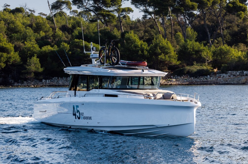 Equipped with a fully enclosed cabin and outboard engines, the first 45 ft. walk-around boat enables owners to speed from jetty to open water in a flash. |
