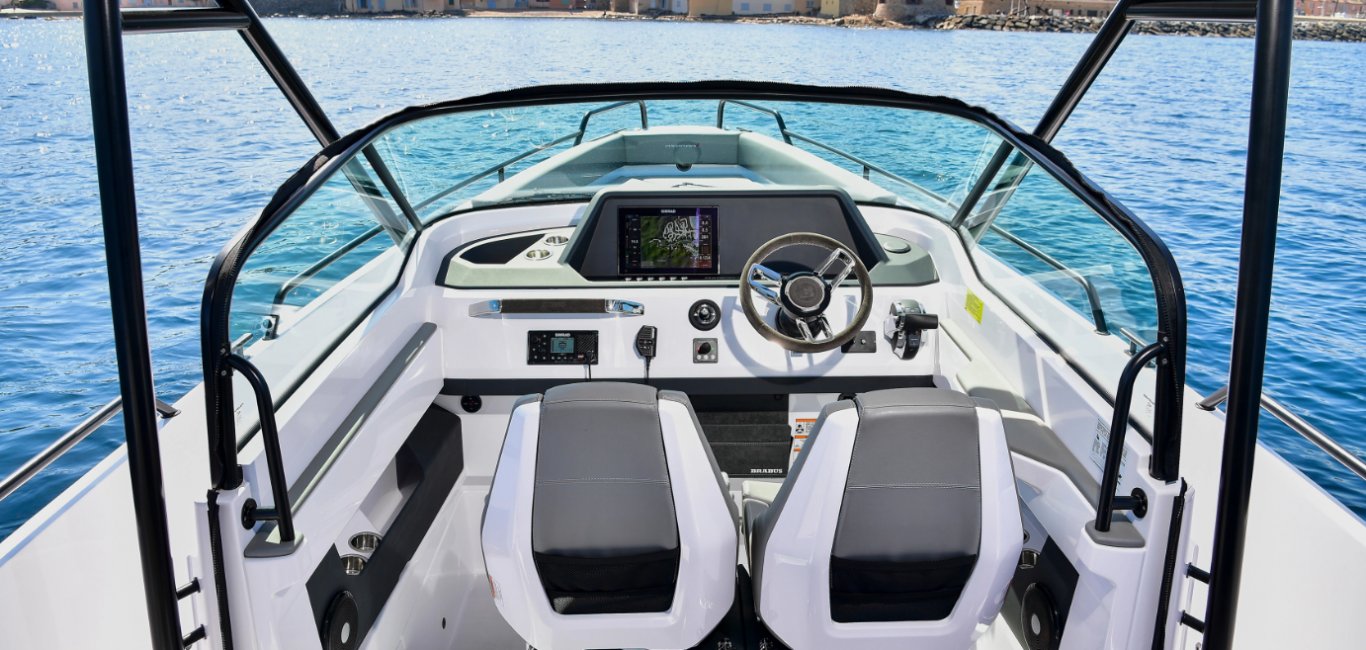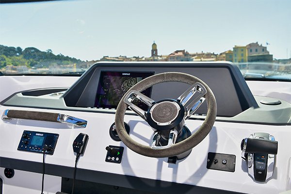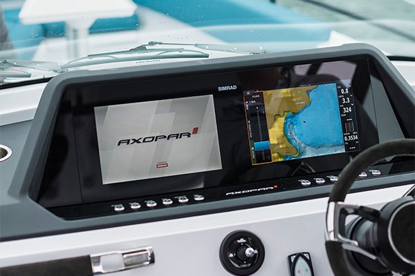 Clean Helm-layout, Dashboard & console top panels in dark grey soft touch finish, Center console panels in black high-gloss finish, Helm panel with passenger side grab rail, Control switch panel in glass w. illuminated push buttons, Steering wheel in leather w. Axopar logo, Main control panel with twin battery switches and automatic fuses for direct supply, Cupholders on dashboard x2, 12V power outlet on dashboard. |