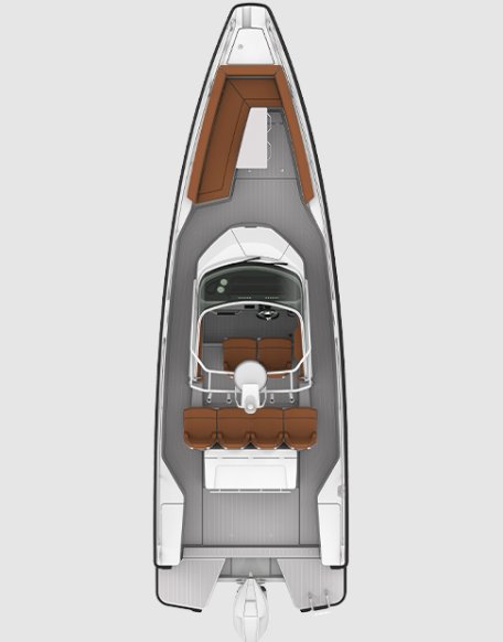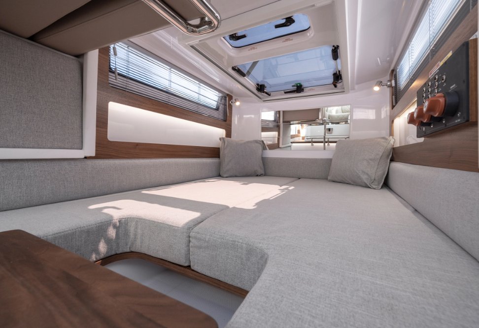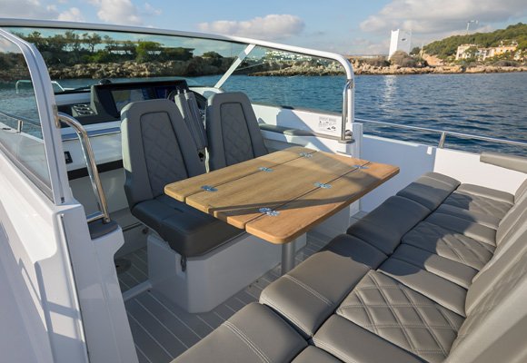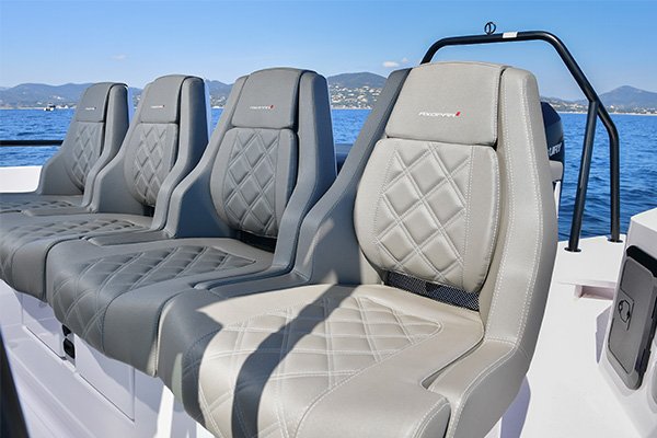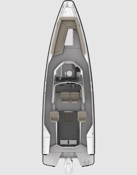 2 x front and 3 x cockpit seats, rotating & length adjustable w. flip-up bolster, Silvertex Sterling fabric on all seats and upholstery, Storage compartment under centre aft seats, Document pocket on console wall, Stainless steel footrest, Lowered floor level at helm section, 2 x LED deck lights in helm floor, Led roof spotlights 2pcs, Harbour cover for helm and front seats, Harbour covering for cockpit seats. |