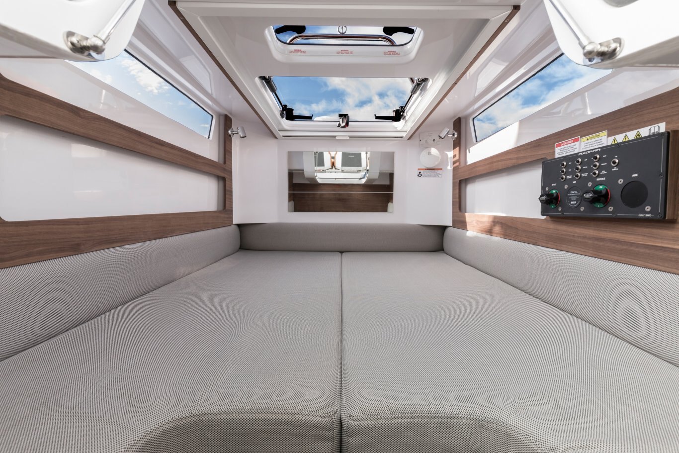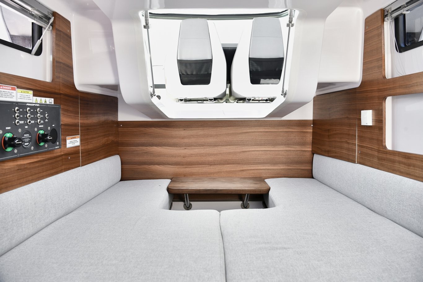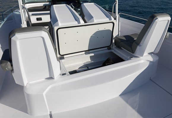 Enlarged stowage area in center console / optional toilet with raised interior finish with headliner and toiled door in double mold integrated window, varnished oak back panel with integrated mirror, 2 LED spotlights in deck stowage / toilet, Main fuse panel with automatic fuses and 12V outlet located in deck stowage / toilet area. |