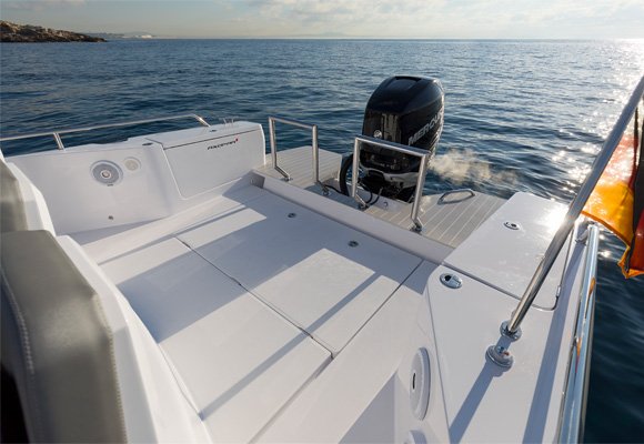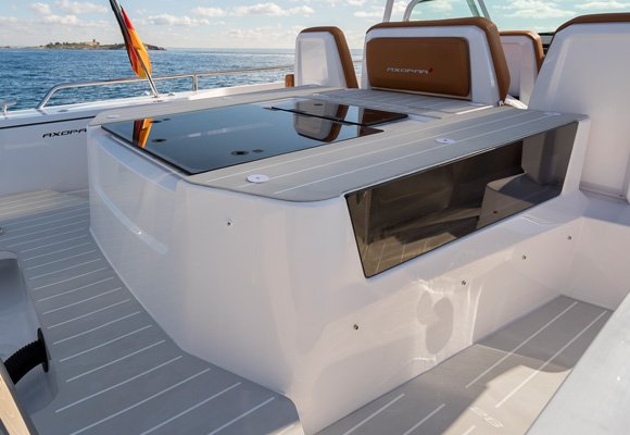 | The modular nature of Axopars, and our multi-platform thinking, enables you to customize your boat with an aft layout to suit your everyday needs. As standard the Axopar 28 Open comes with a spacious open aft deck. The aft deck can be also equipped with an optional wet bar module, or an aft cabin. |