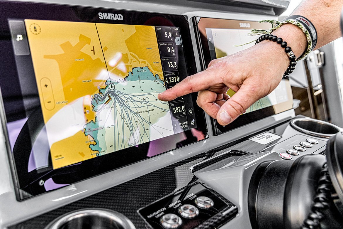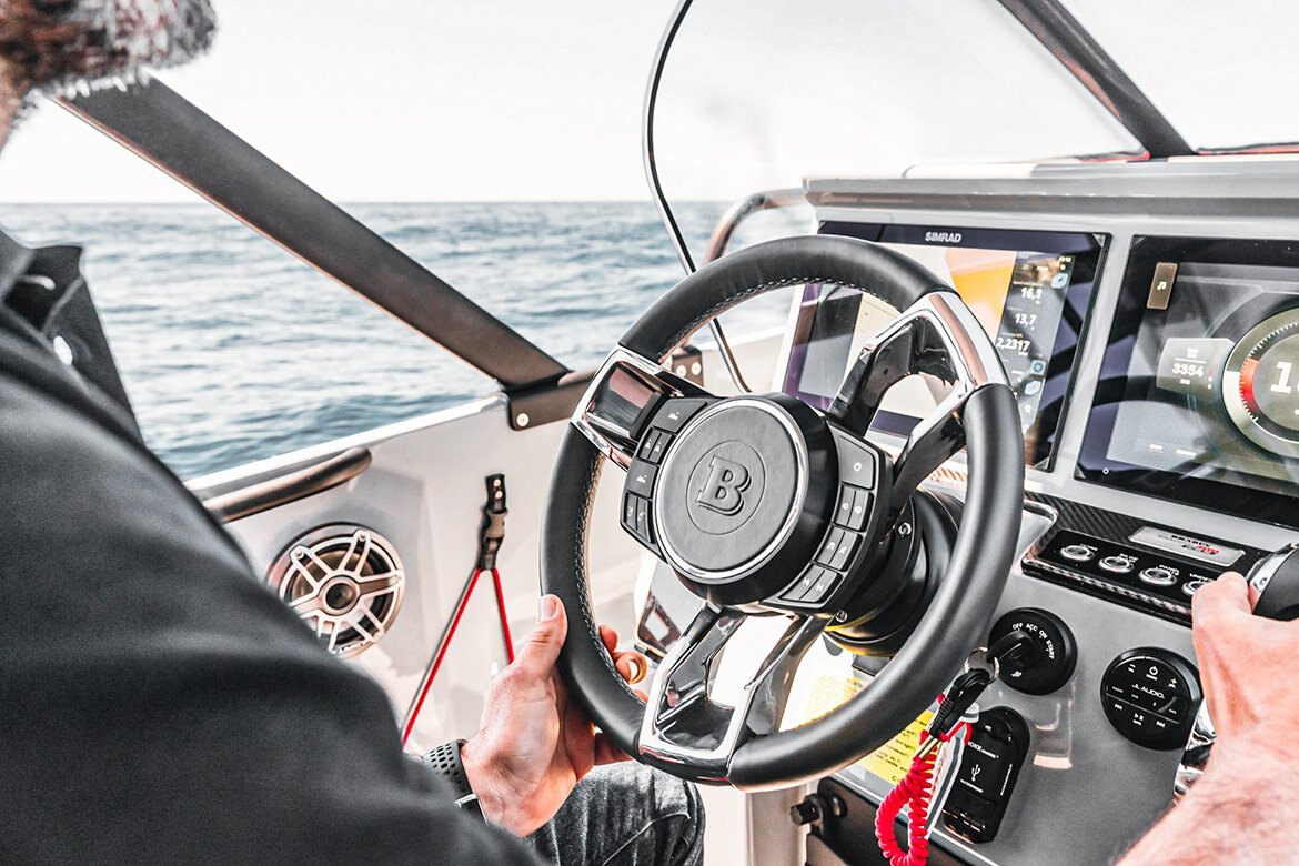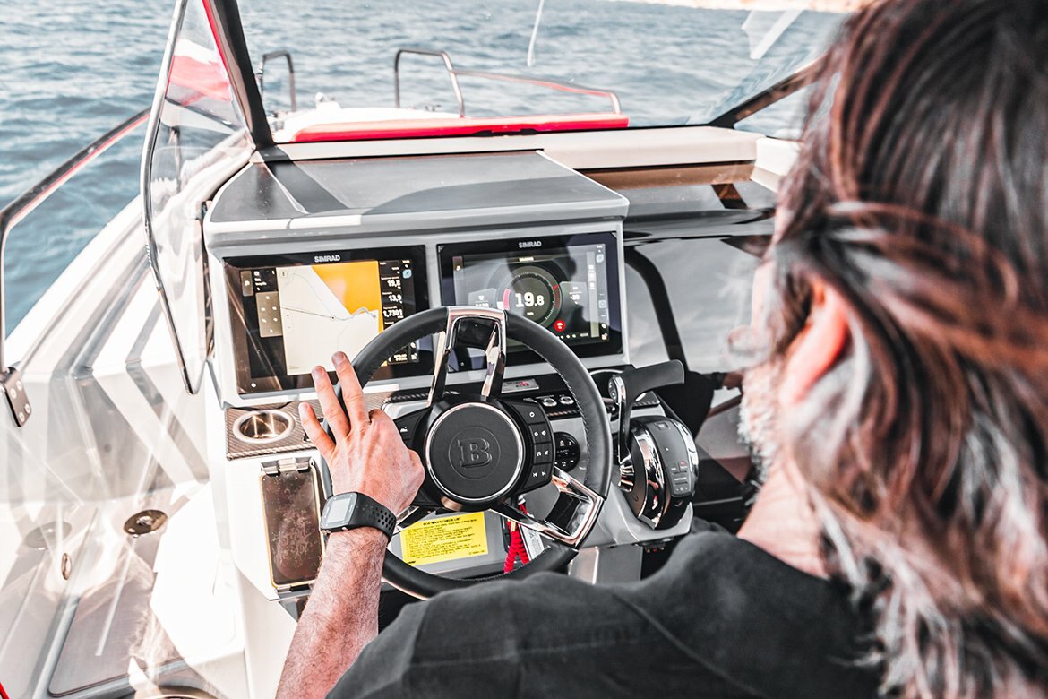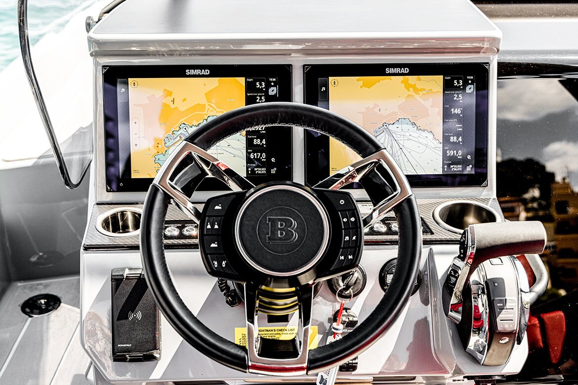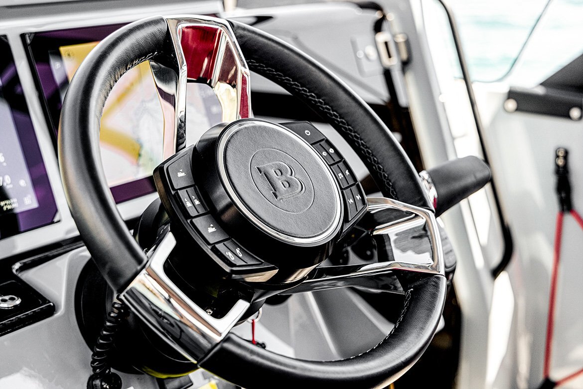 The BRABUS Shadow 300 range is built to be fun and easy to drive. From options like a multifunctional steering wheel to an electronic windlass, the boat is fitted with impressive technological advancements to improve its hallmark maneuverability and handling. Selectable dual NSX™ 12“ multi-function Simrad displays deserve separate mention. The Smart Chartplotter features powerful navigation as well as custom software, designed to make exploring the great blue even easier and more thrilling. The optional RGB deck and underwater lights make the boat stand out while at anchor and ensure fishing enthusiasts can spot fish in dark and murky waters.