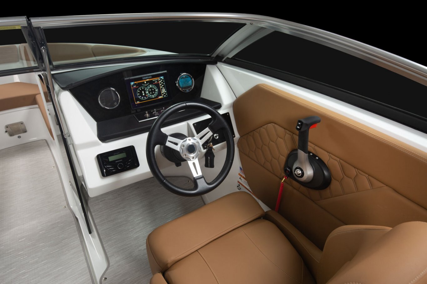 • Windshield w/walk-thru, full-height, curved glass, exclusive design