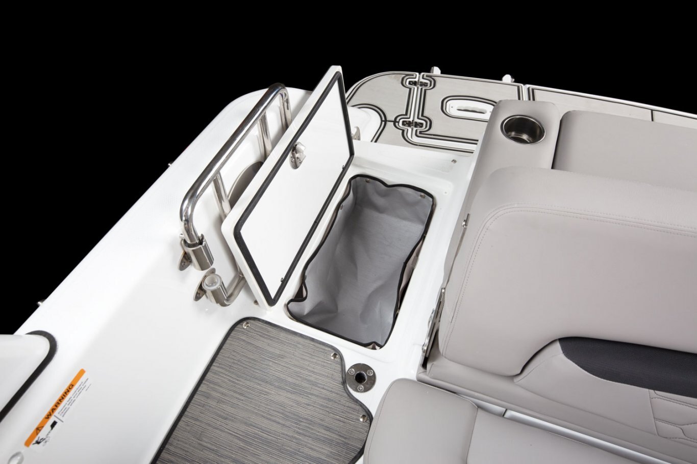 • Storage, bow, behind backrest at helm