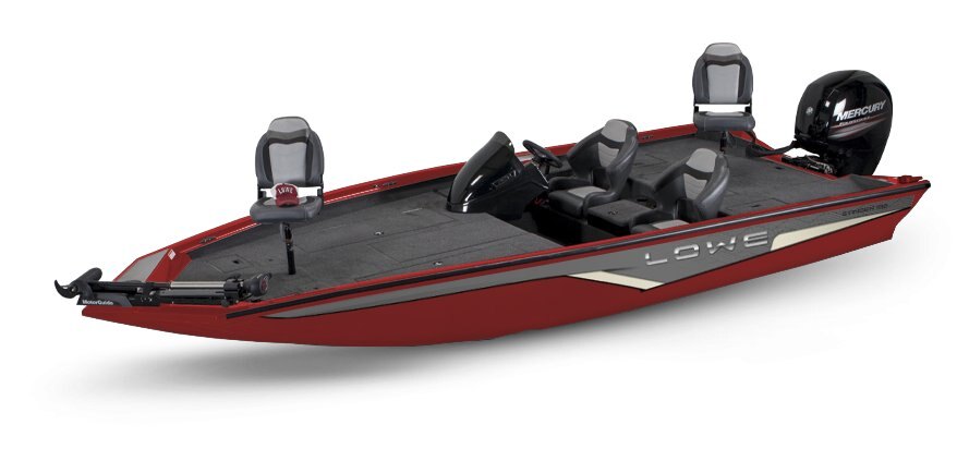 At nearly 20 feet long and a max 150 horses, the all-welded Lowe® Boats Stinger 198 is a big, bold, and brawny fishing machine that’s poised to find the big fish and win the big bucks. This legendary aluminum bass-fishing boat boasts a 94” beam and 83 square feet of fish-fighting deck space, and it’s equipped with premium folding pedestal seats, aerated livewell, a MotorGuide® X3 45FW trolling motor, and a locking center rod box with 8 tubes for rods up to 8’6”. Stylish touches including red-tinted hull accents, chrome gauge bezels, and a sleek, red backlit console with metal flake add luster to your fish-fighting dominance.