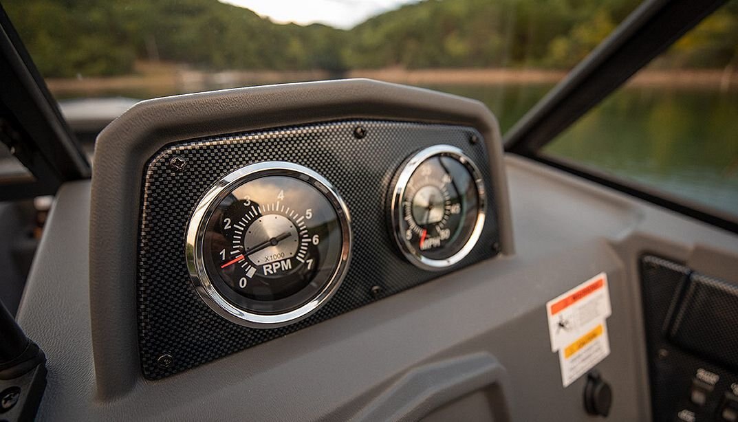 The solid helm of a Lowe Fish and Ski has cool looking accents, 4:1 anti-feedback steering, and a soft grip wheel. Sharp full-size tach, speed, fuel, volt & trim gauges – with room left for other devices.