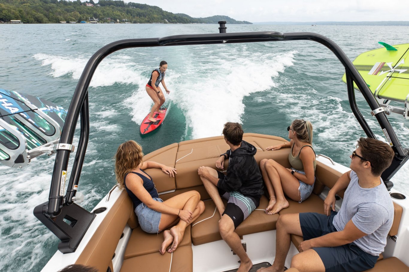 The GTD 245 Surf provides all the space you need for a full day of wake sports! Duel helm adjustable seats make it easy to watch the surfer and communicate with the driver. An asymmetrical bow and u-shaped cockpit provide plenty of room for everyone to be comfortable throughout the day while at its end, the GTD 245 Surf's large swim platforms provide multiple ladders because boarding your ride should be effortless.