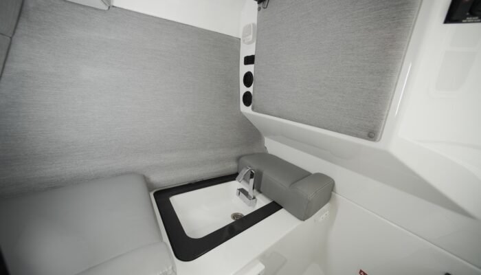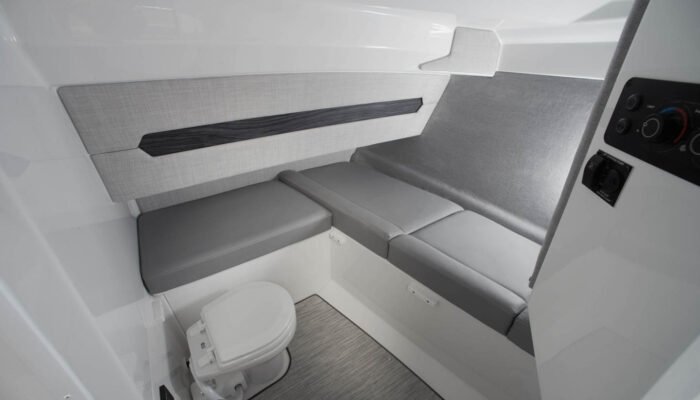 Find a large, step-down exterior-cabin compartment with a sink console, pump-out Porta Potti, VacuFlush options, tinted skylight, and heat and air conditioning vented from the cabin HVAC. Experience the unique center-access cabin and step down into the space for added overhead height with lounging/ large cushion surface to stretch out.