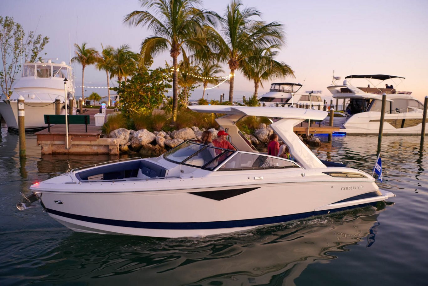 The elegant A29 features a surprising range of amenities—including a dual Garmin Glass Cockpit touchscreen, a spacious day cabin with a portside walk thru, plus the fun and convenient Splash & Stow inflatables management system that makes every day on the water memorable.