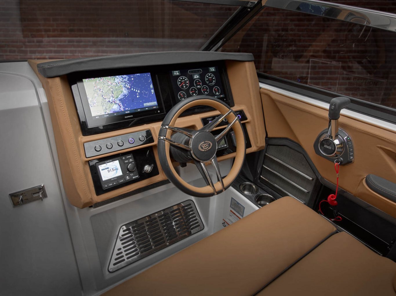 A captain-focused double-wide helm offers the Cobalt glass cockpit with dual 10” or optional 12” Garmin instrumentation, ergonomically positioned controls and a rich, custom-stitched console.