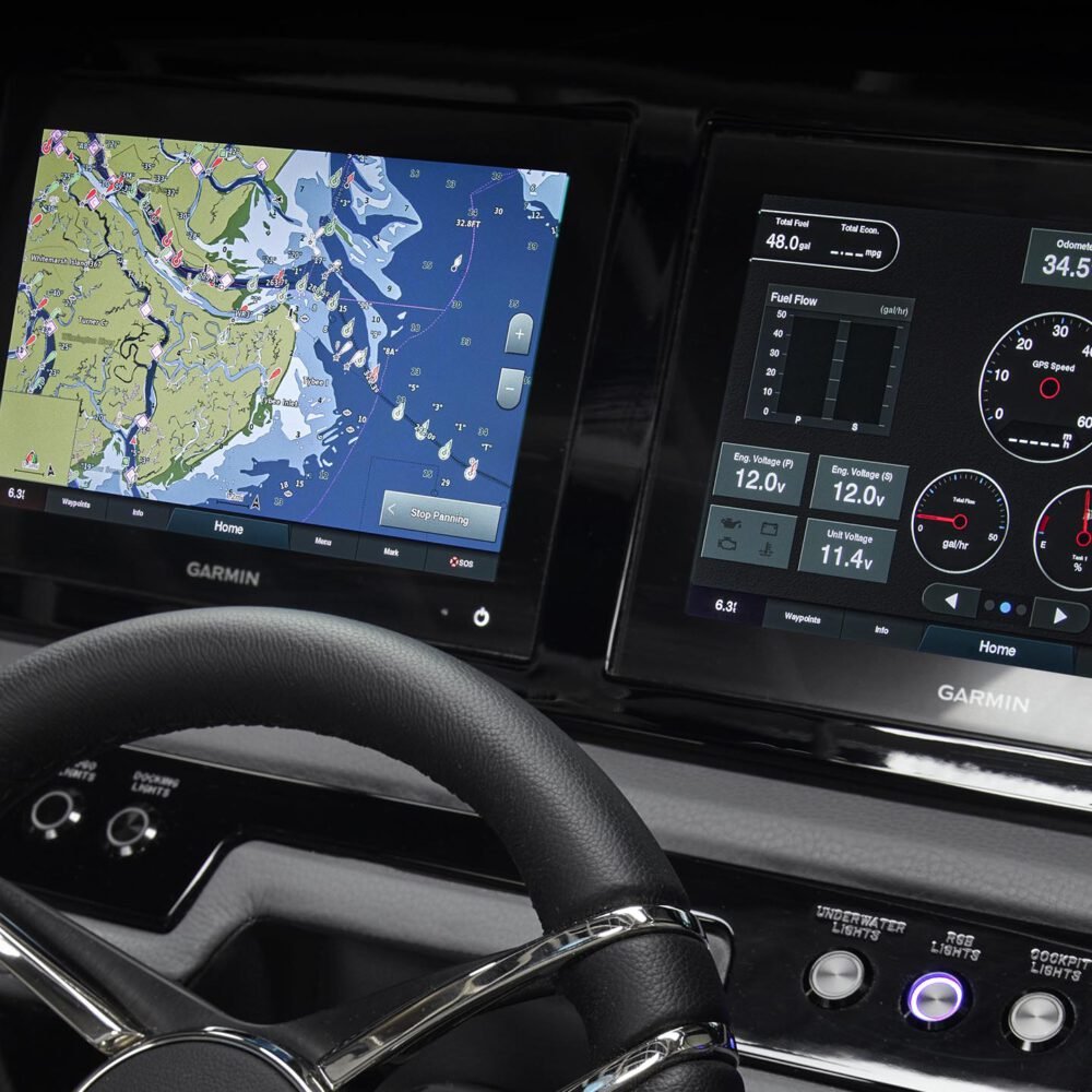 The Cobalt Glass Cockpit System is the premier multi-display solution for total helm control. The Garmin interface is fully integrated with the most pivotal handling and safety information from your Cobalt powertrain. The result is the ultimate boating experience now available with larger screens on select Cobalt models. |